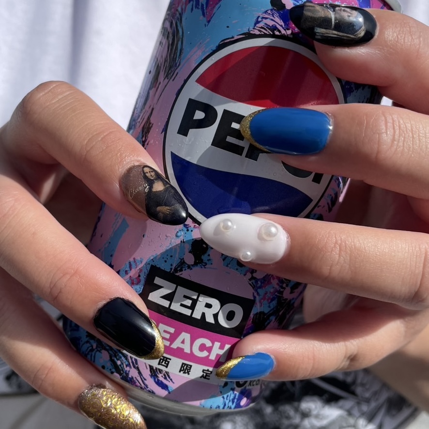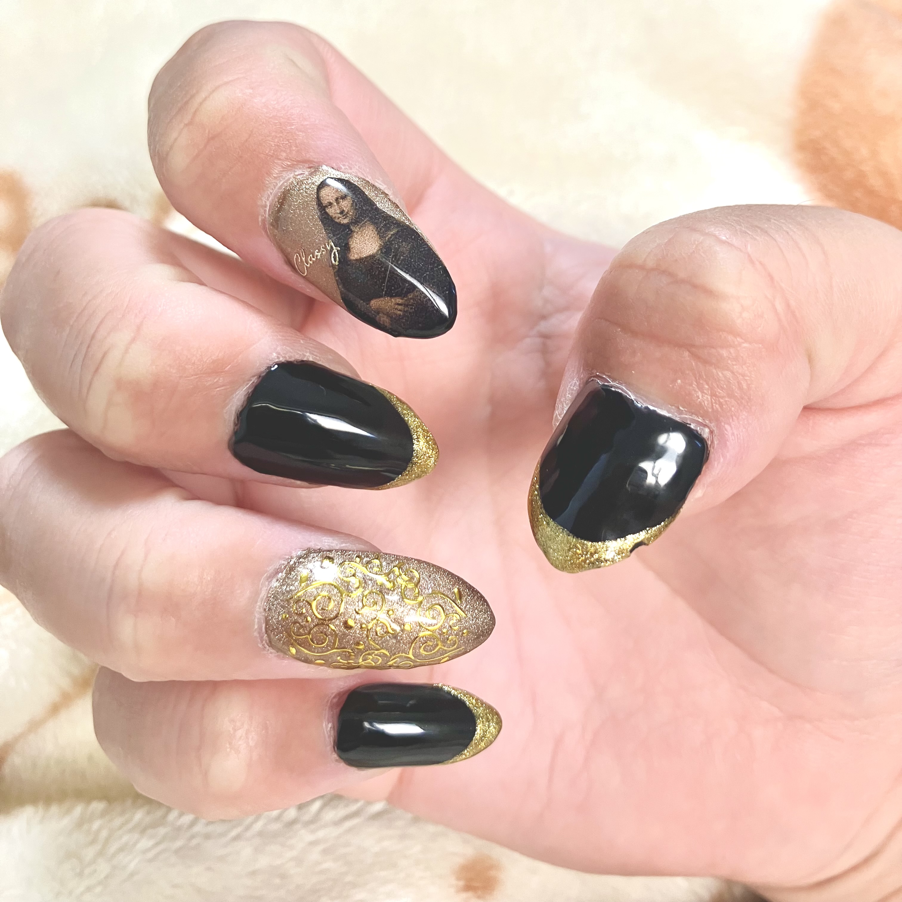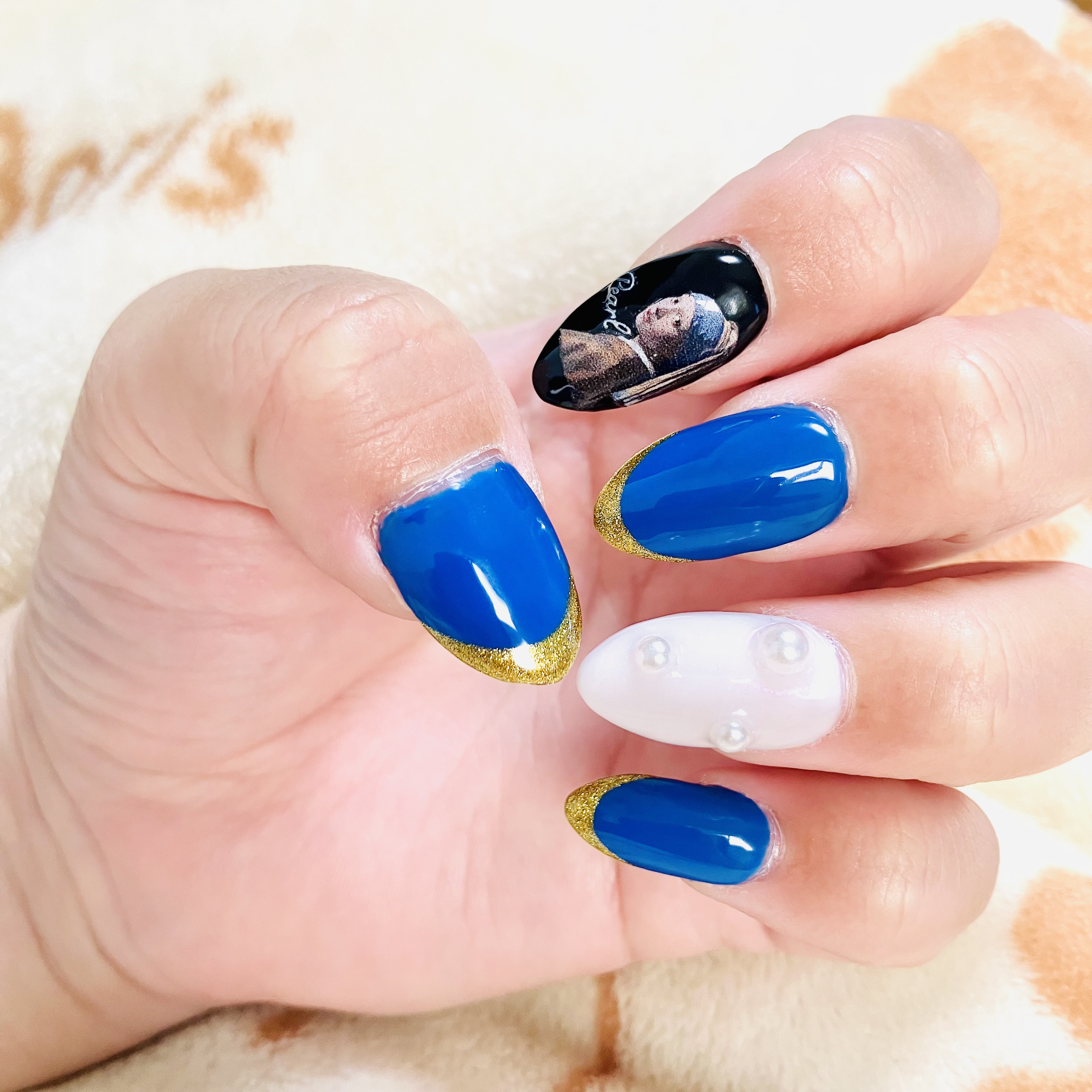 今月のネイルは、Seriaのシールを使い美術作品をイメージしました。 右手はモナリザ、左手は真珠の耳飾りの少女。 左手が特に気に入っていて、黒→絵画の背景色・青→色を濃いめにしましたがターバンの一部の色・薬指→偏光パウダーを使い真珠っぽさを出しパールのパーツを装飾。 初めてチップで長さ出しをしてみましたがいい感じです。 2025/04/21 15:46